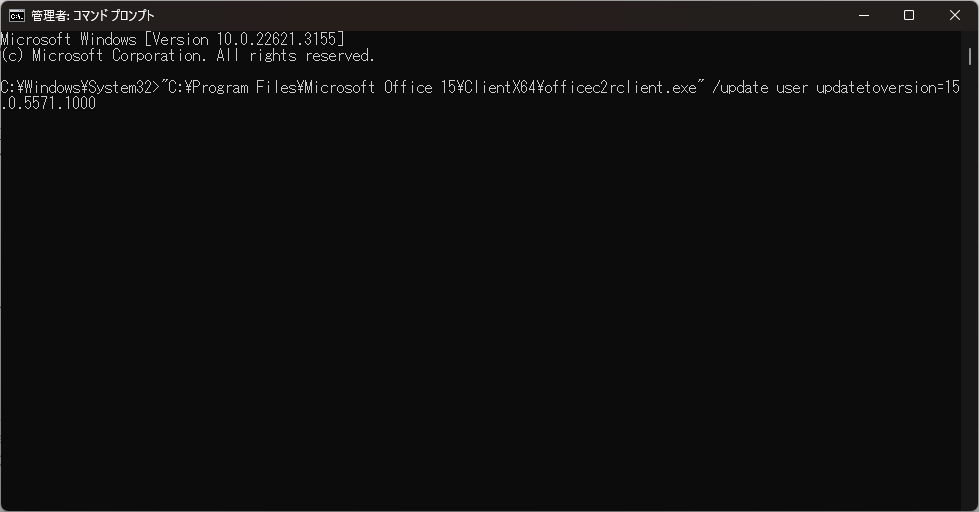 "C:\Program Files\Microsoft Office 15\ClientX64\officec2rclient.exe" /update user updatetoversion=15.0.5571.1000を貼り付けし、Enterで実行する - ロールバック(更新)の作業をすすめるために、起動しているすべてのOfficeソフトを閉じる