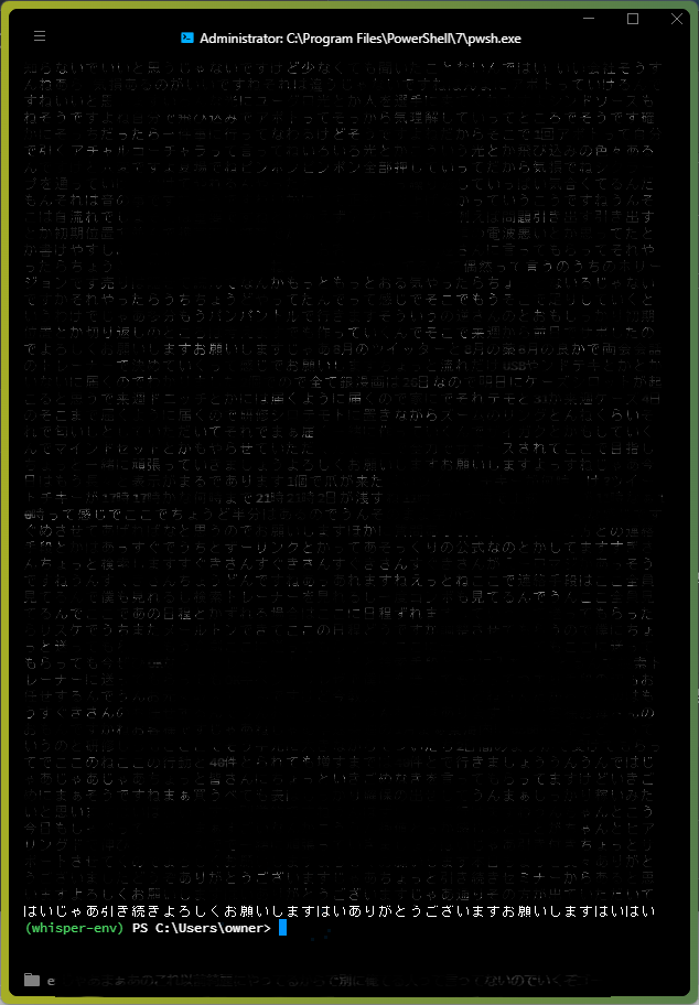 result = model.transcribe(r"C:\Users\owner\Documents\hoge.m4a", language="Japanese")