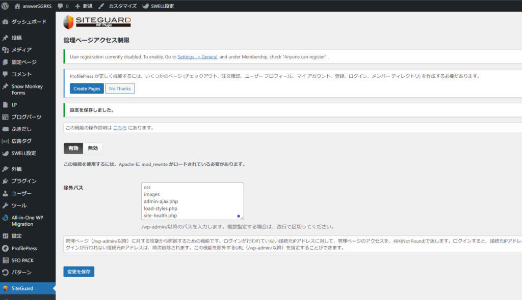 そのあと、管理画面に入れていた場合は、「管理画面>SiteGuard>管理ページアクセス制限」の設定を無効にすれば、.htaccessも書き換えが行われ、アクセスが可能になります。